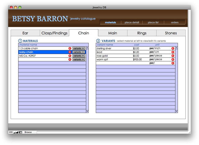 A jewelry building application was developed; wherein, raw materials, their variants, and prices are initially entered. Pieces are then built up from these materials. Material summaries are generated; costs, labor, and wholesale prices are calculated. Images (ie. sketches, photographs) can be attached to a pieces record. Vendor orders are entered, and material lists generated.