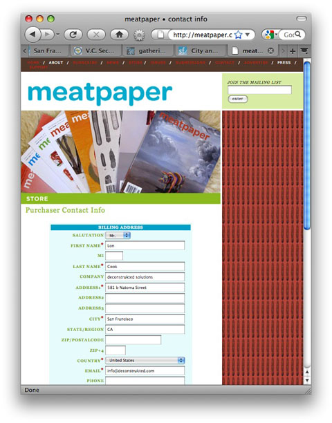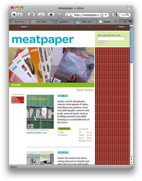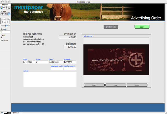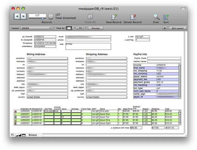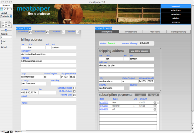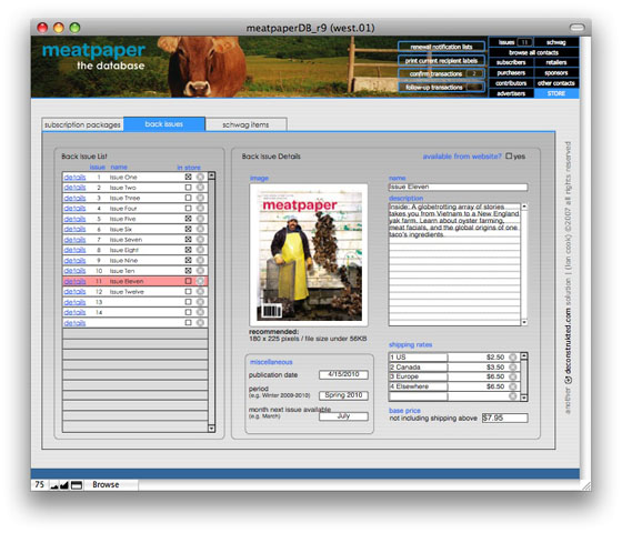 meatpaper presented a blank slate. Required were subscriber, advertiser, retailer and sponsor databases. The database needed to handle gift subscriptions, tracking gifter and giftee, as well as multiple supscription tiers. Invoices for advertisers and statements for subscription payments were required.